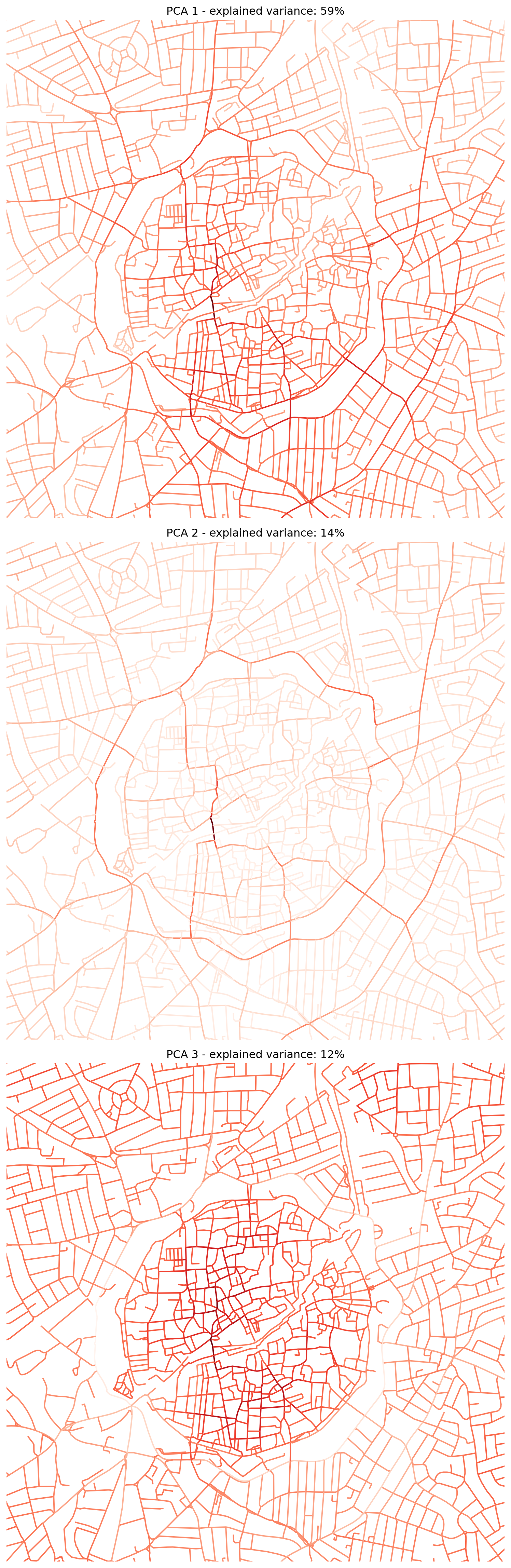 pca_1,pca_2,pca_3,pca_4) to thenodes_gdfGeoDataFrame. - The subsequent code sets up a 3x1 plot to visualise the spatial distribution of the first three principal components. Each subplot shows the nodes coloured by their score on a principal component. The title of each subplot indicates the percentage of the original data’s variance that is explained by that component. This helps in understanding how much information is retained by each component.