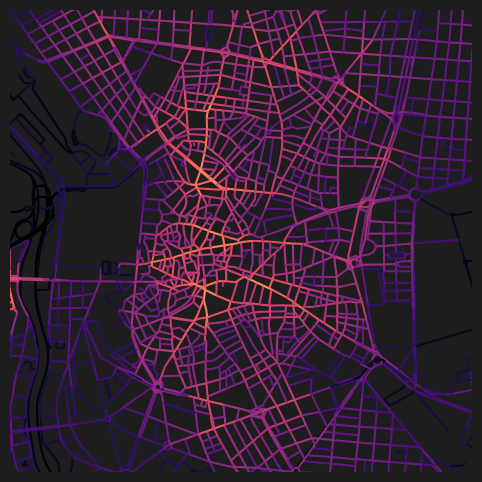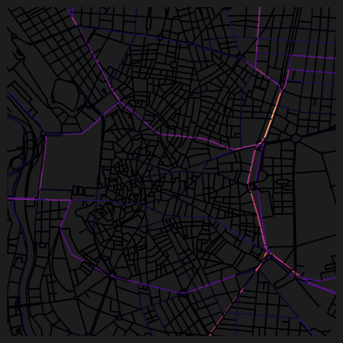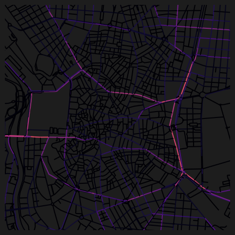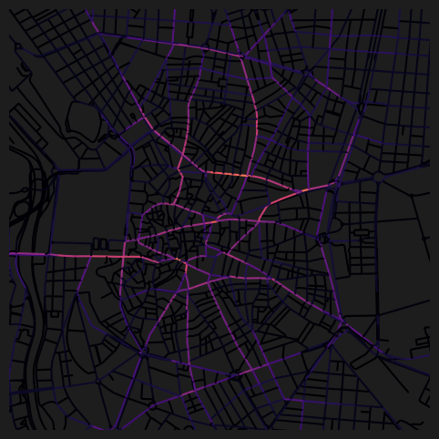 WARNING:cityseer.centrality:Tolerance 20.0% is high — values above 2% increasingly diffuse route concentration, especially at larger distance thresholds.